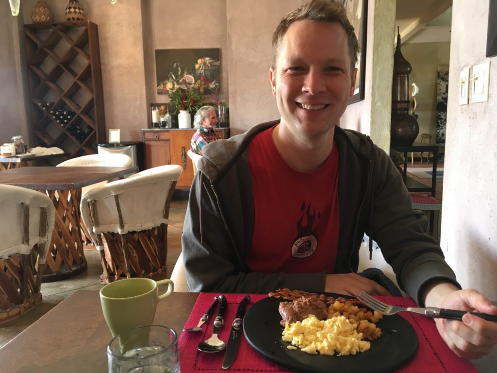 Kevin gets in some reading at the restaurant in Agua de Vid.