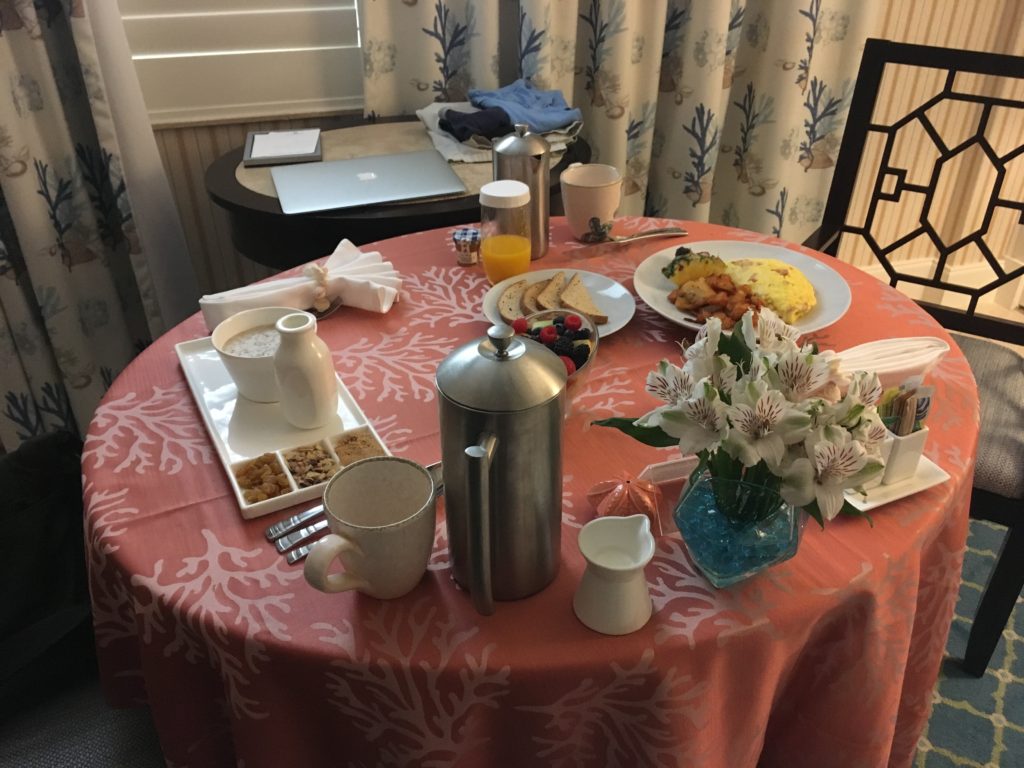 We can’t believe it’s our final day. We pre-ordered room service the night before for 7 AM. And promptly the cart arrived with our incredible breakfast. Not cheap, but so delicious (and charged to Kevin’s work, eh hem!).