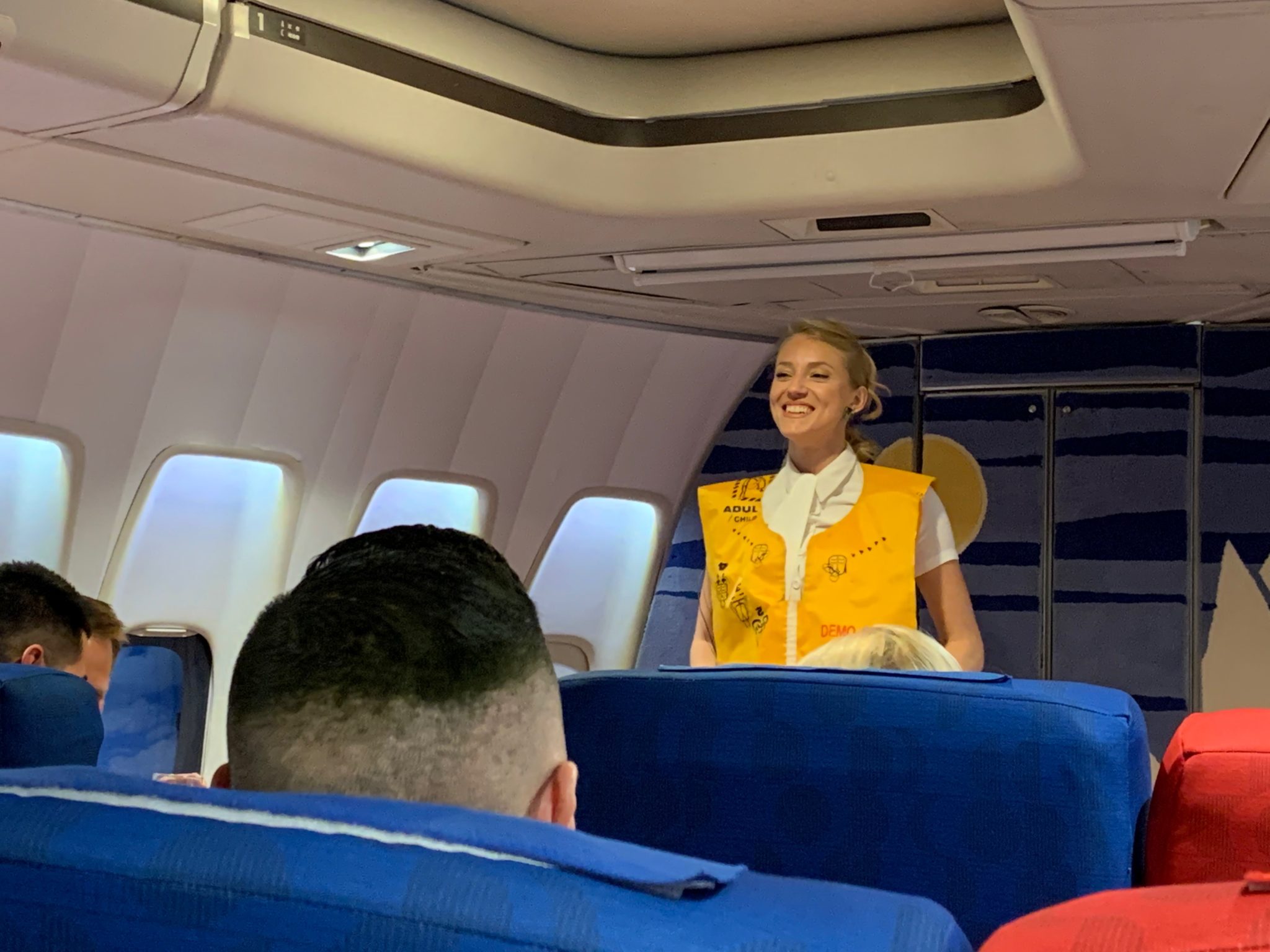 Before take off, it’s time for the safety briefing with an overview on how to use the seatbelt and inflatable flotation device in case of an emergency if we were actually in the air.
