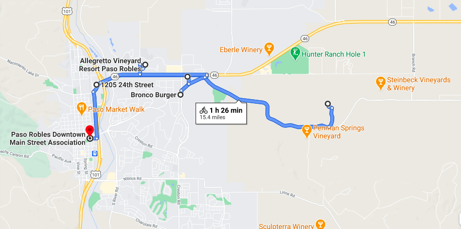 But first things first, you’ll need to rent a bike (if you didn’t bring it with you). We rented a pair of bikes from Paso Bike Tours and Rentals. The company is open year round and will drop off the bike rentals to the front door of your accommodations. The easiest way to arrange is by texting them directly at 805-440-5085. Rentals start at $49 per bike and they take credit card. I suggest having them drop off the bikes the night before your bike tour. That way, you can hit the road first thing in the morning.