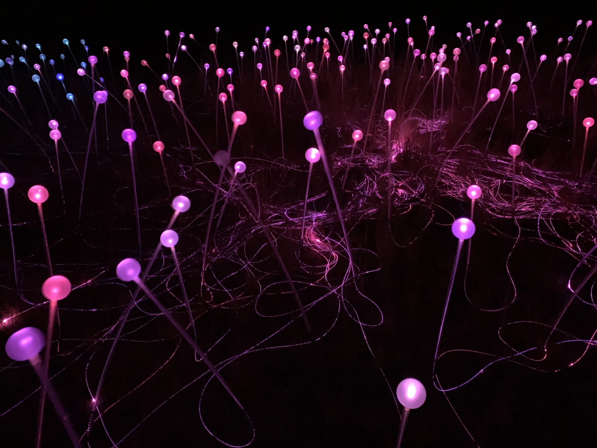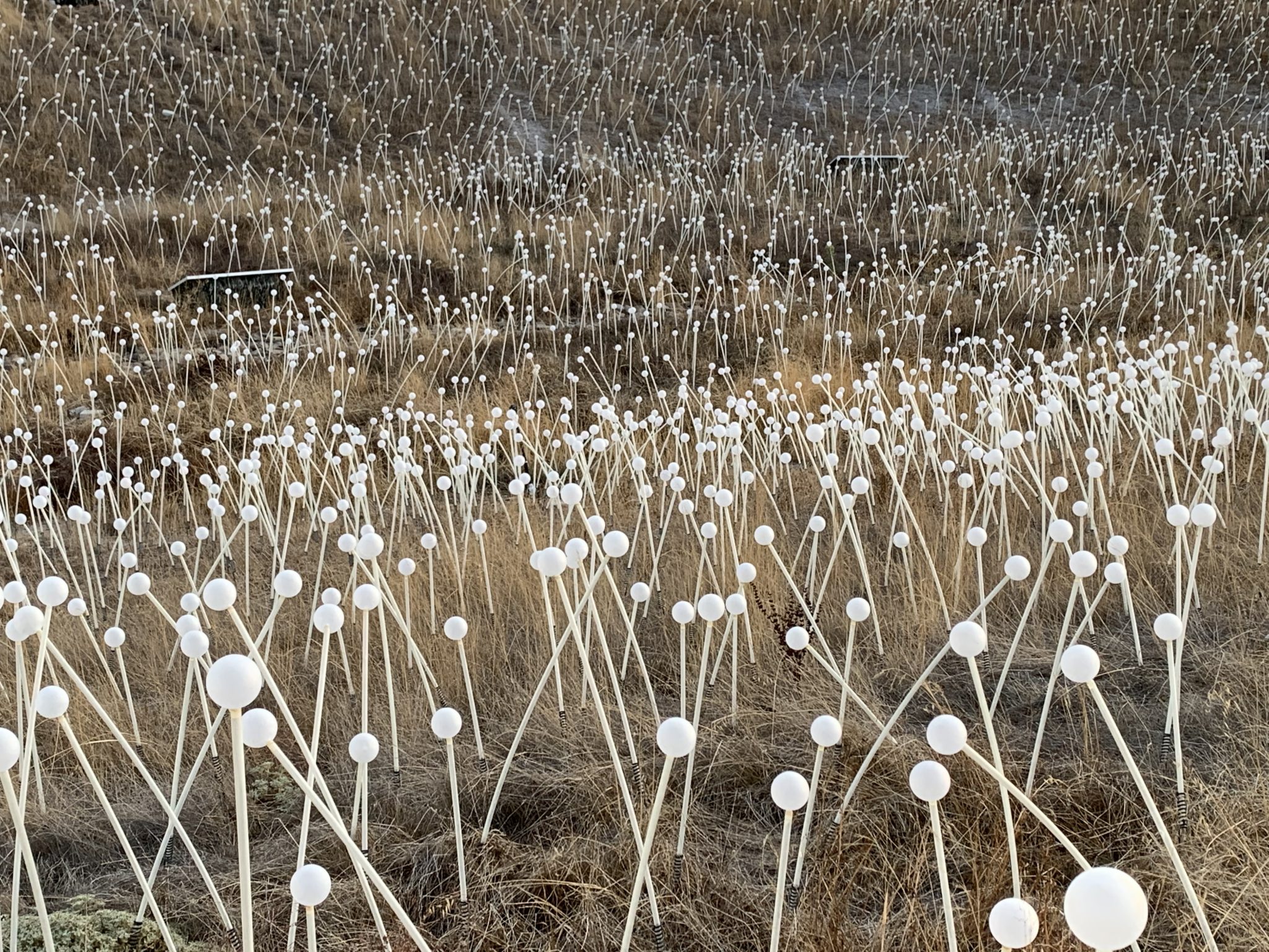 British artist Bruce Munro has created quite a visual wonderland — displaying more than 58,800 fiber-optic lights along the rolling hills of Paso Robles. Powered by solar panels, the stemmed spheres subtly change colors while lighting up the hillside around you. Blink and you might miss the color changes. In fact, the only way we could see the colors switch was by watching the outer areas of the exhibit very closely.