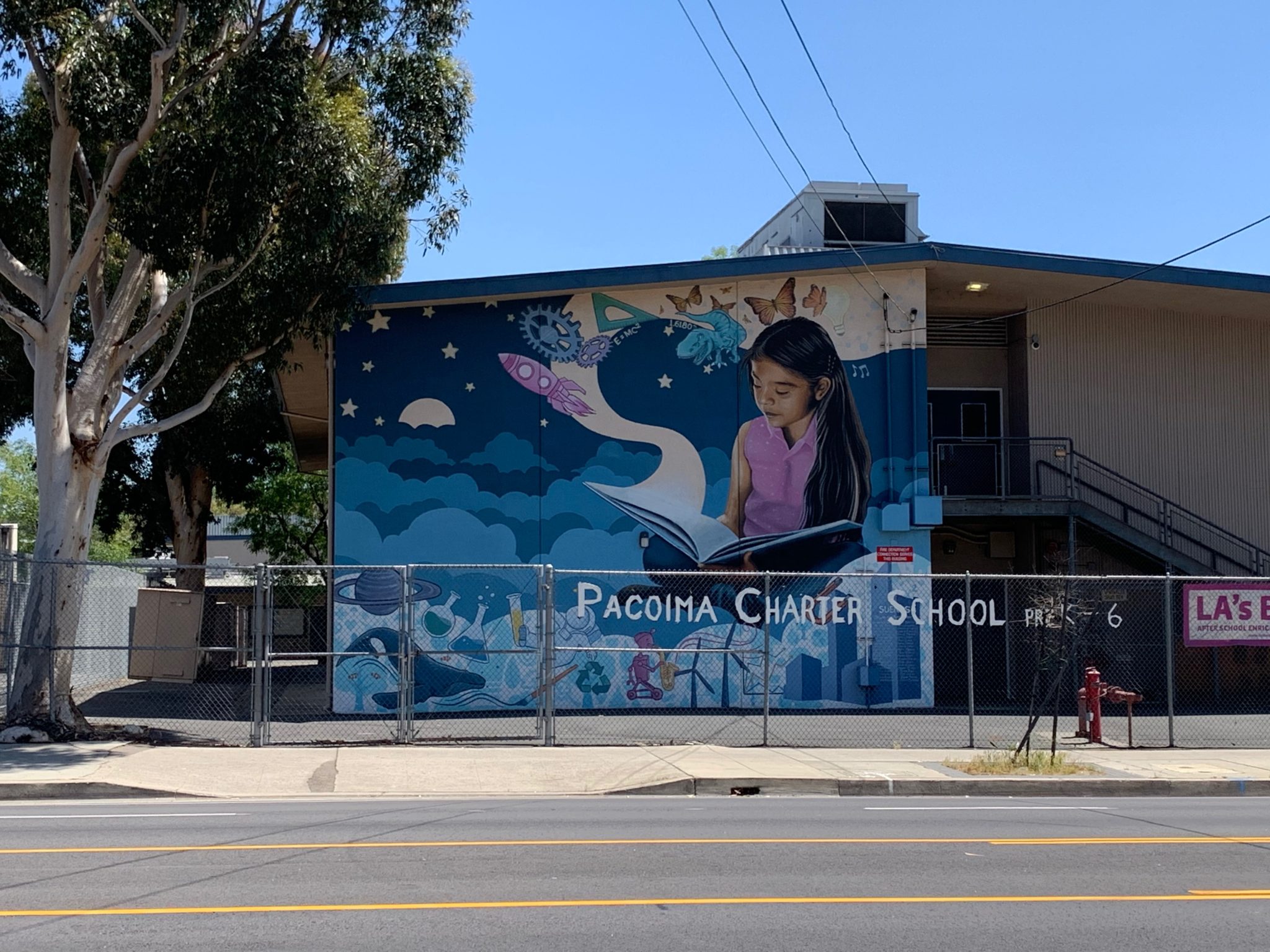 You’ll start this journey by walking southwest on Van Nuys Boulevard (towards De Haven Avenue). There are more than 50 murals along the route — with many tucked away behind fences and not completely obvious. But there was no missing the very first mural on the route, located along the side of Pacoima Charter School.