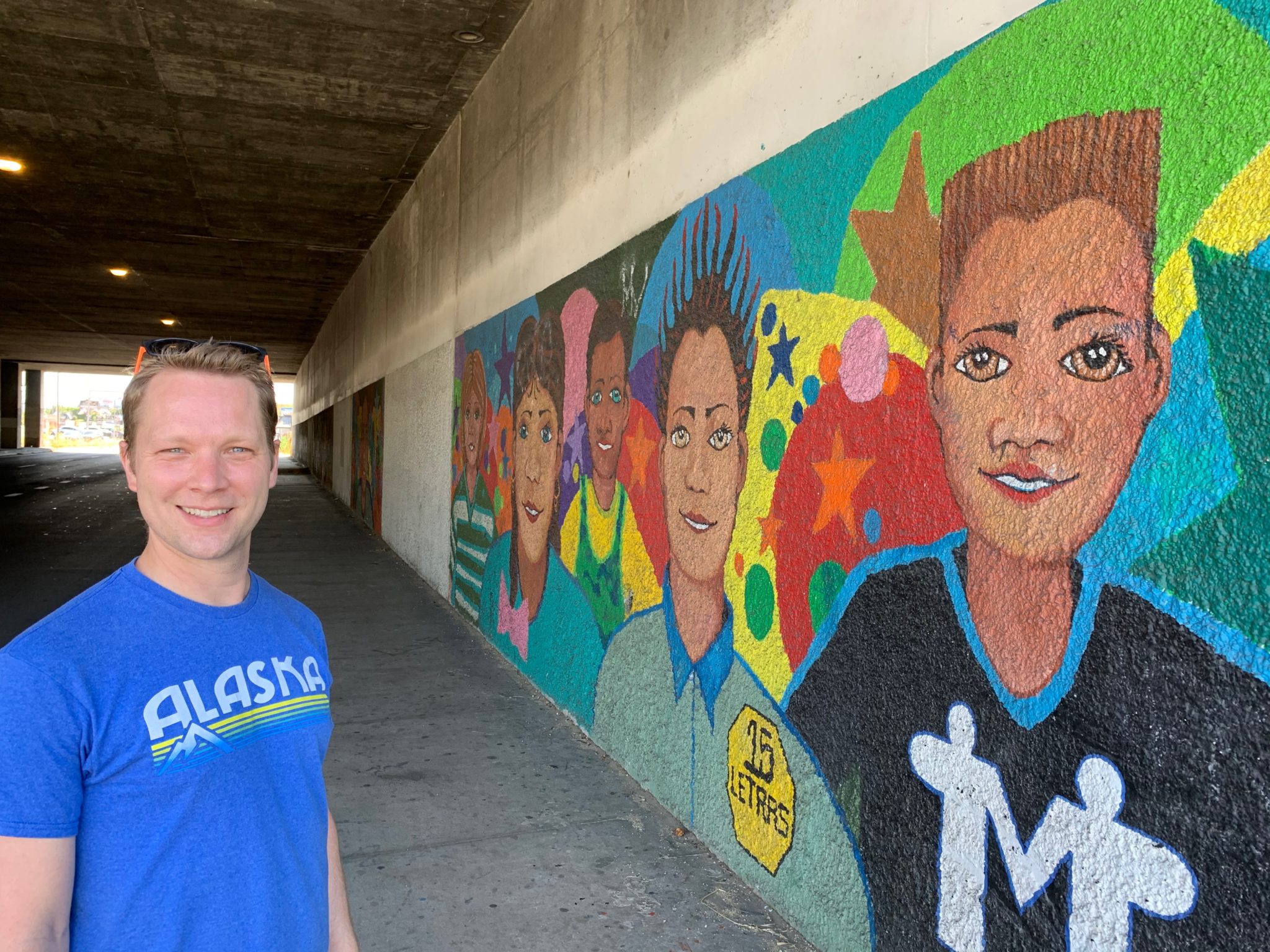 Murals line the overhead bridge for the freeway. You’re reaching the turnaround point.