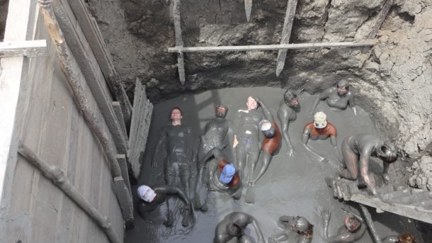 Once inside, workers will slap mud all over you. Kevin (wisely) asked them to avoid his head and face. I, on the other hand, told them to go nuts… Only to later find mud all over me — I’m talking in my ears and other places you’d rather not want to read about. I looked like the last-place contestant in one of those tough mudder races.