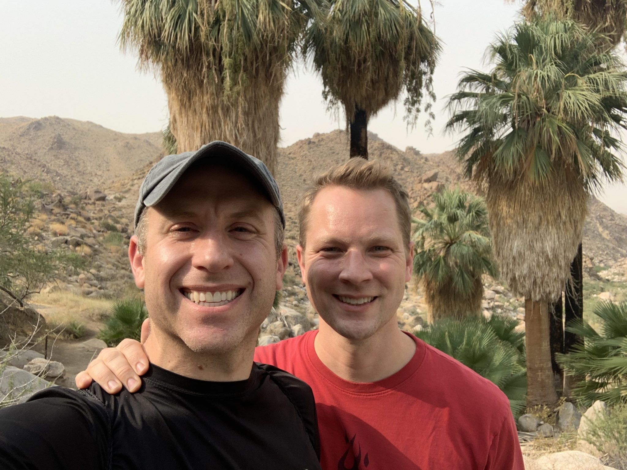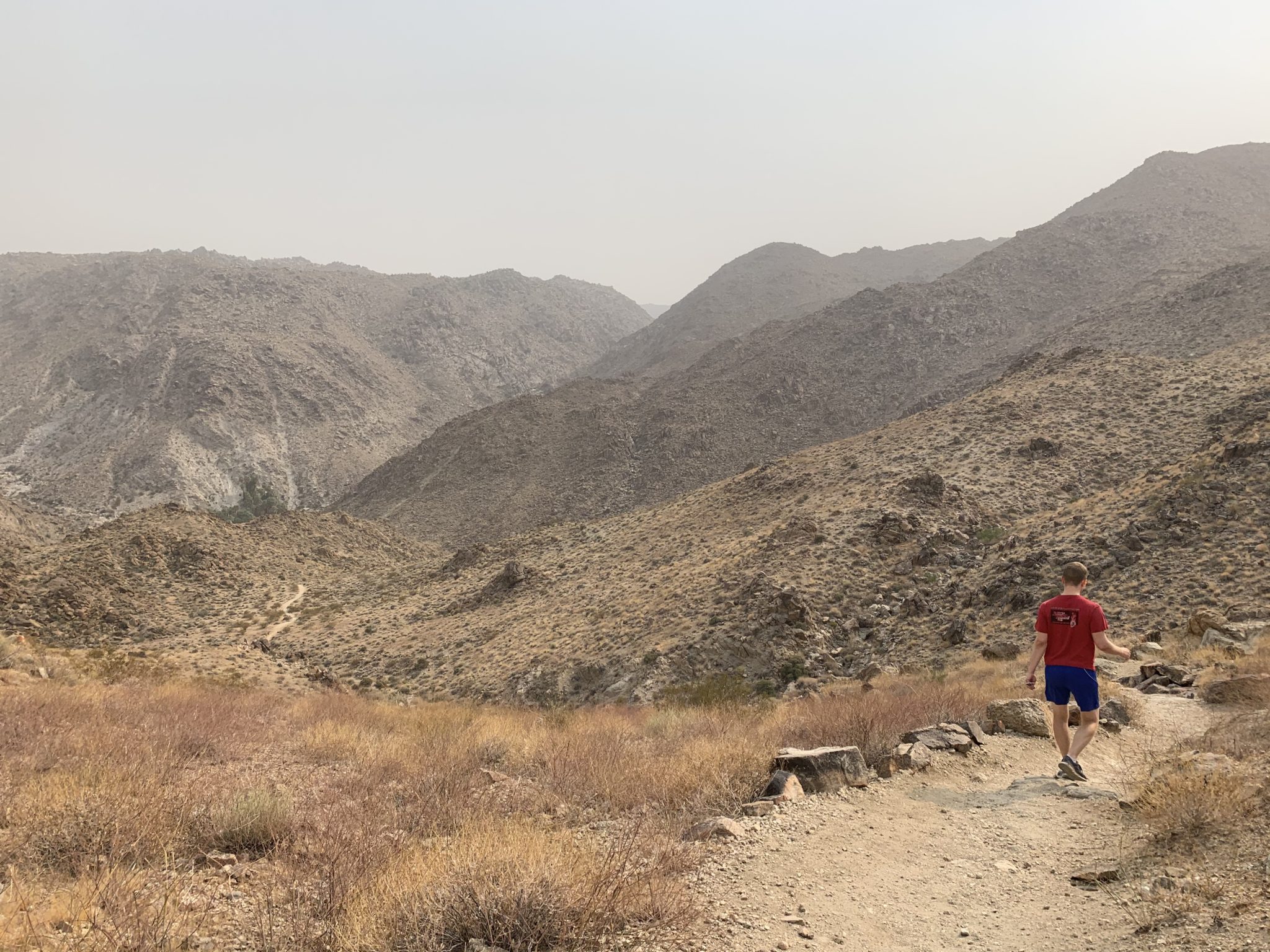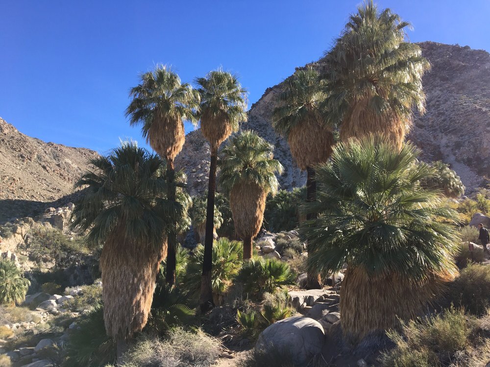 The 3 mile trail is moderate in that it climbs about 350 feet in elevation and has several climbs up throughout the hike. We find these to be a little more challenging since you have to hit the hills on the return. Though, we think the hike is still a great option for families since it’s fairly short and has a great payoff at the end — a collection of palm trees surrounded by a spring. In fact, you might blink your eyes thinking you’re seeing a fake oasis given there is zero vegetation around for miles.