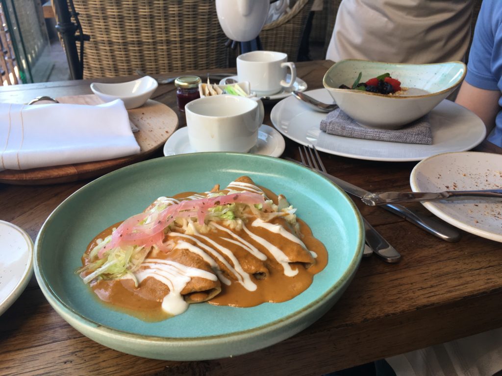 The phenomenal breakfast at La Aurora – our first stop at the art complex. Chilaquiles (left) and fried eggs and beans (right)