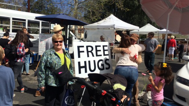 Free hugs at the Ojai Farmer's Market. My mom passes even after our urging!