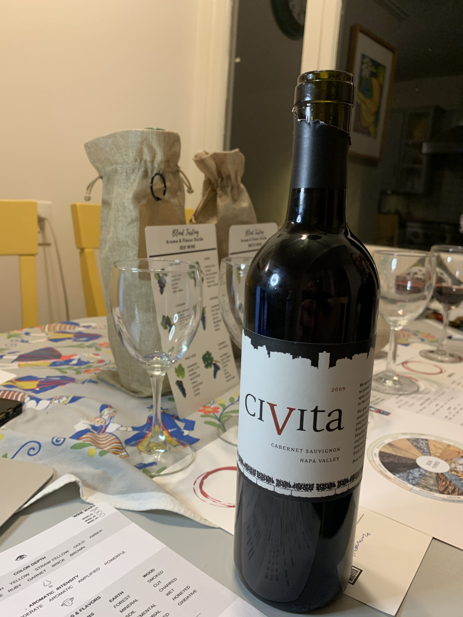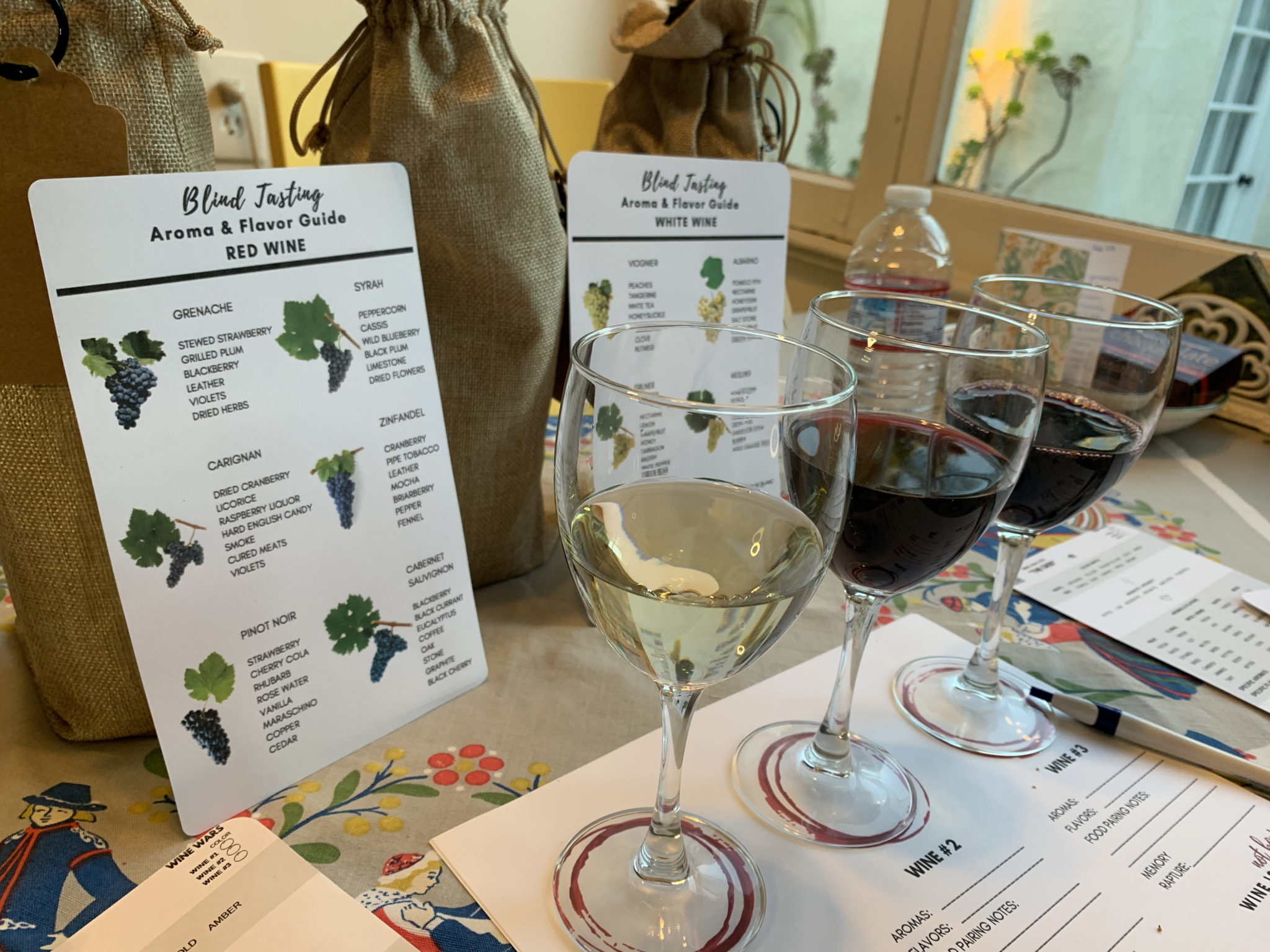 The wine package arrived about a a week ahead of the tasting — neatly packed up with everything you’ll need including scoring sheets, a color chart to measure the age of the wine and aromatics and flavor cards to help you guess. Also, this is a blind tasting game. Each of the wines come in burlap bags and are numbered. So no peeking inside!